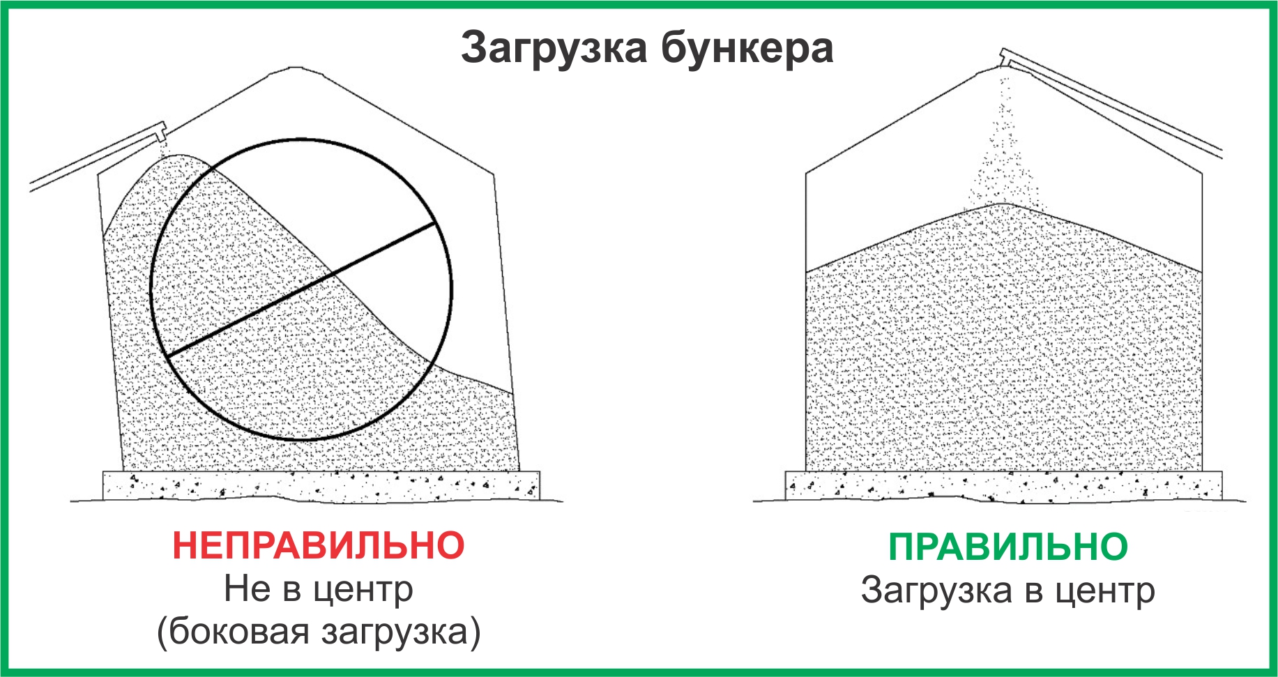 Прежде, чем преступить к заполнению силоса Кирк Нельсон рекомендует обслуживающему персоналу элеватора соблюсти нижеприведённые правила техники безопасности: • Убедитесь, что силос полностью очищен, прежде чем его снова заполнить зерном. • Убедитесь в исправности выгрузного оборудования, это легче сделать, пока силос пуст. • Прежде, чем закрыть все двери, убедитесь, что внутри силоса никто не находится. • Закройте внутренние дверные панели, они должны быть герметичны и зафиксированы. Стальная оболочка силоса при всей своей прочности может быть легко деформирована в случае неравномерной загрузки или разгрузки силоса. Поэтому для того, чтобы избежать деформации силоса при его загрузке зерно должно засыпаться ровно в центр. Нецентральная загрузка зерна по стенкам со смещением на одну сторону силоса может спровоцировать опрокидывание у основания, и как следствие привести к наклону хранилища, его опрокидыванию или изгибу элемента жесткости.
